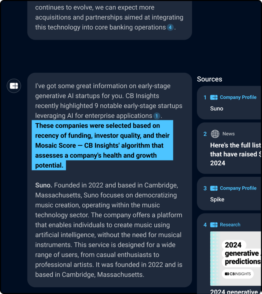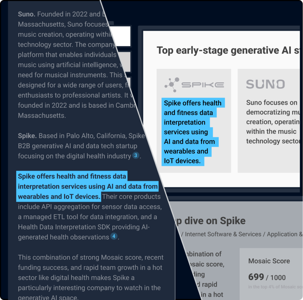 Way beyond the Internet and public LLMs. Built on our proprietary database. Hundreds of millions of insights and documents on private and public companies – including revenue, company hiring insights, and exit probability.