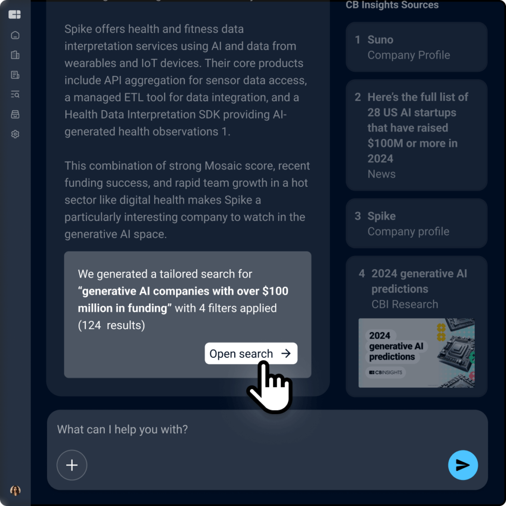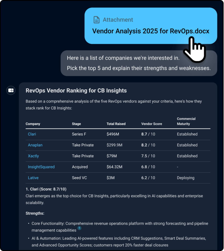 ChatCBI includes ready-to-run use cases. Want an M&A deep dive? Market analysis? Competitive teardown? Just tap the magic button.