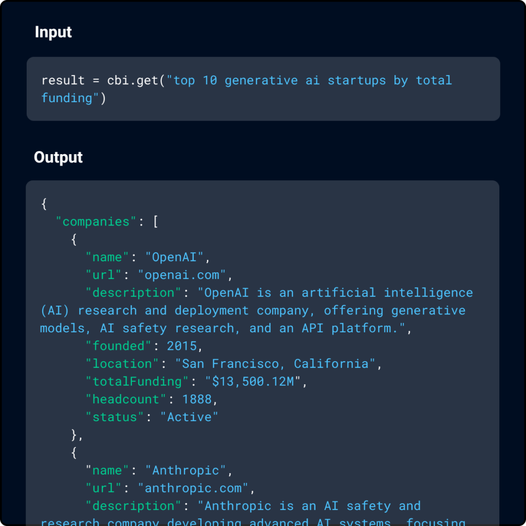 Your internal AI models have a new friend. Incorporate ChatCBI into your genAI projects and apps as an expert predictive intelligence agent. It has full access to our Business Graph that spans 10 million companies and 1,500 markets.