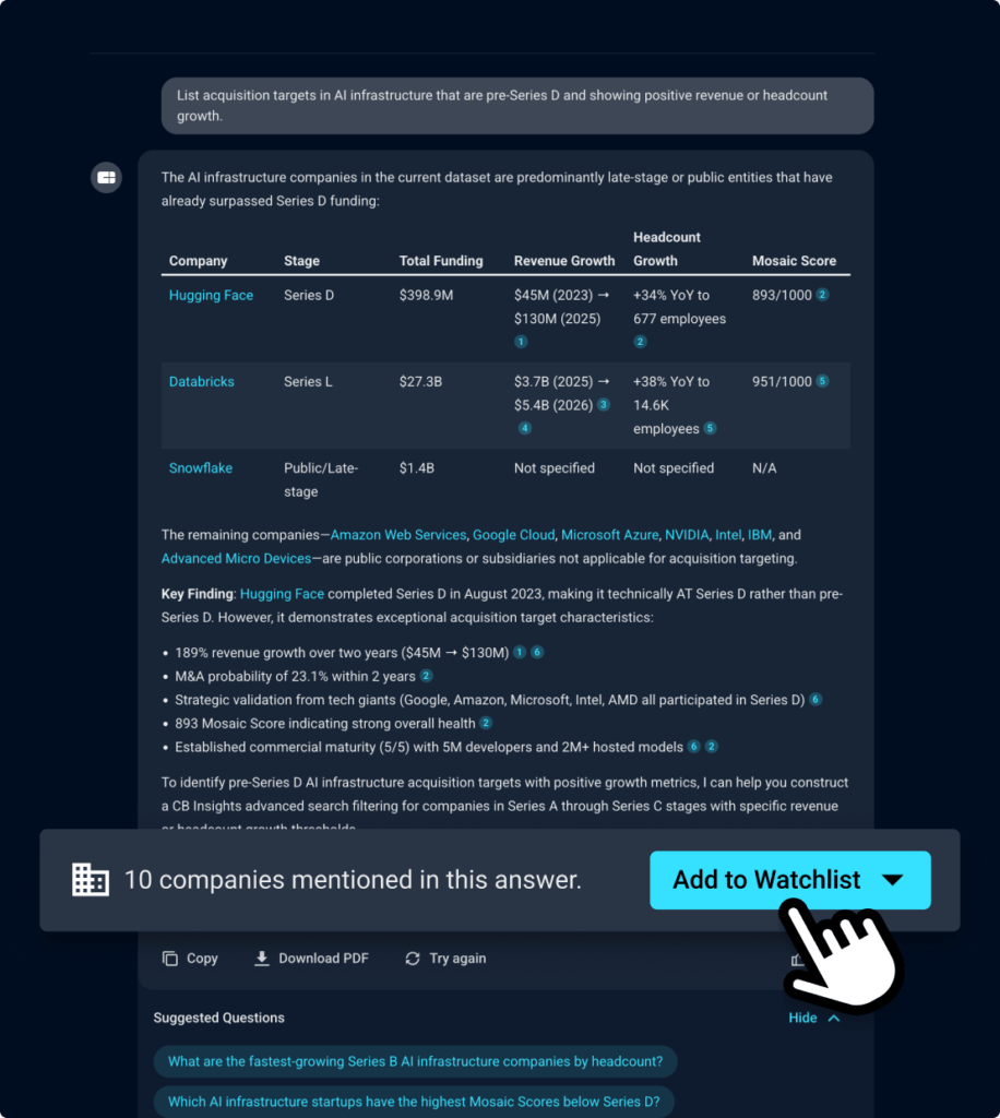 Turn natural language into precise search logic across 11M+ companies. Build high-quality target lists using 60+ filters – from growth signals to funding stage – then refine with relationships, deals, and investor data. Save to Watchlists and track how targets evolve.