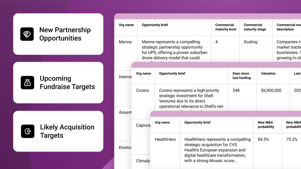 Get daily alerts on potential partners, fundraising targets, and acquisition prospects — months before they’re on anyone else’s radar. Each signal comes with clear analysis on why they’re flagged, why they matter, and next steps for you to take.