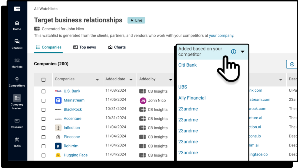 One simple list to instantly view and track your competitors’ customers and partnerships. It’s a great way to examine their strategy and spot new opportunities for your business.