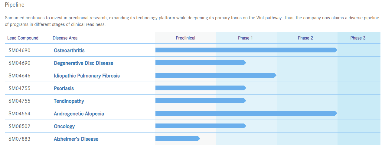 The company claims that WNT levels “get out of balance” with age, resulting in disease. Samumed’s current pipeline targets diseases associated with aging such as osteoarthritis — a degenerative joint disease where the cartilage at the ends of bone wear down — and degenerative disc disease.