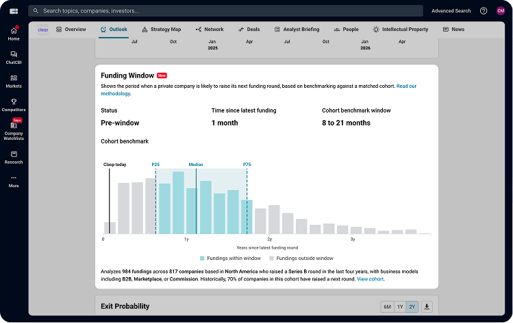 See when companies are likely to raise capital. Uses peer benchmarking across our deal dataset to predict funding timing, helping teams spot opportunities early and set alerts to act on upcoming raises.